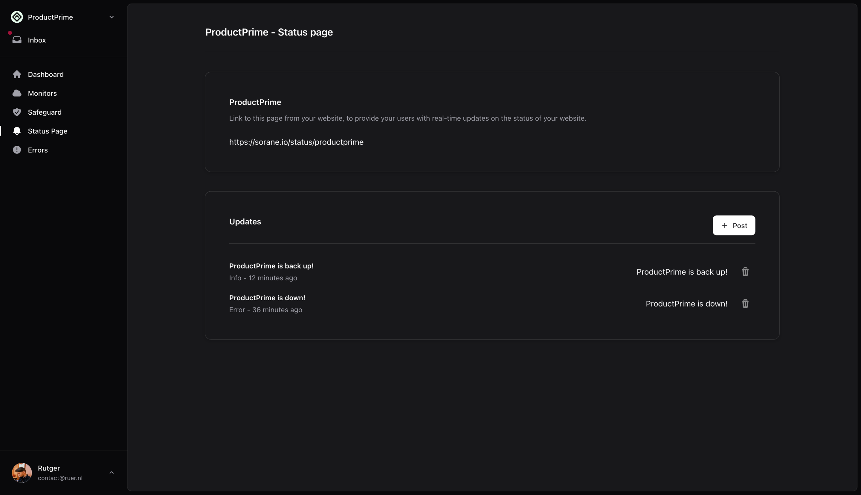 Build trust with professional public status pages. Sorane creates a dedicated status URL for each of your Laravel websites where users can check availability, see ongoing incidents, and track resolution progress. Proactive communication reduces support tickets and builds customer confidence.